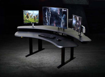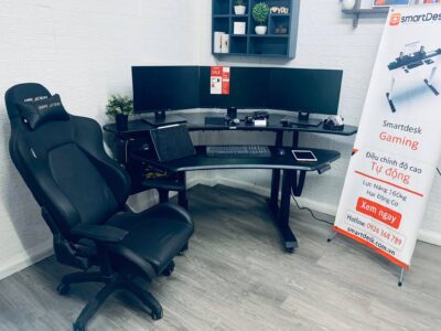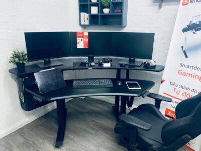 Với mặt bàn kép kích thước rộng có thể chứa tối đa 3 màn hình mở rộng , độ cong 90 độ có thể bố tri ngay góc tiết kiệm được không gian cho căn nhà của bạn .